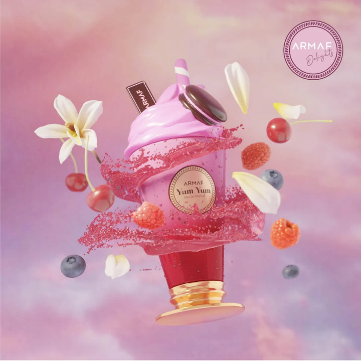 Yum Yum von Armaf ist ein köstliches und elegantes Eau de Parfum, das fruchtige Frische mit floraler Raffinesse vereint. Schon die Kopfnote belebt mit Bergamotte, Kirsche, Orange und roten Beeren die Sinne. Die Herznote offenbart eine sanfte Mischung aus Vanille, Rose und weißen Blüten, die Sanftheit und Weiblichkeit verleiht. In der Basis hüllen Amber, Moschus und eine pudrige Note alles in eine zarte, anhaltende Wärme. Ein strahlender und verführerischer Duft, ideal, um den Alltag zu bereichern oder kostbare Momente zu würdigen.
